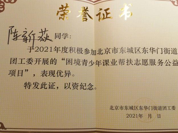 毕可嘉同学是BV伟德官方网站2021级本科1班的学生。自踏入大学校园的那一刻起,便立志成为新时代一名学业优异、素质全面的大学生。在2023年,她积极投身于课业辅导、健康宣传、医疗保健和环境保护等多方面的志愿服务工作,累计服务155小时。特别是在东华门街道团工委组织的“课业帮扶困境青少年”项目中,毕可嘉同学与团队携手,为遇到学业挑战的青少年提供可靠支持,帮助他们克服困难。如其所言,这些志愿服务经历不仅能加深对社会的全面认知,在提升沟通技巧和团队协作能力等方面也颇有助益,还为她未来的职业生涯奠定坚实的基础。