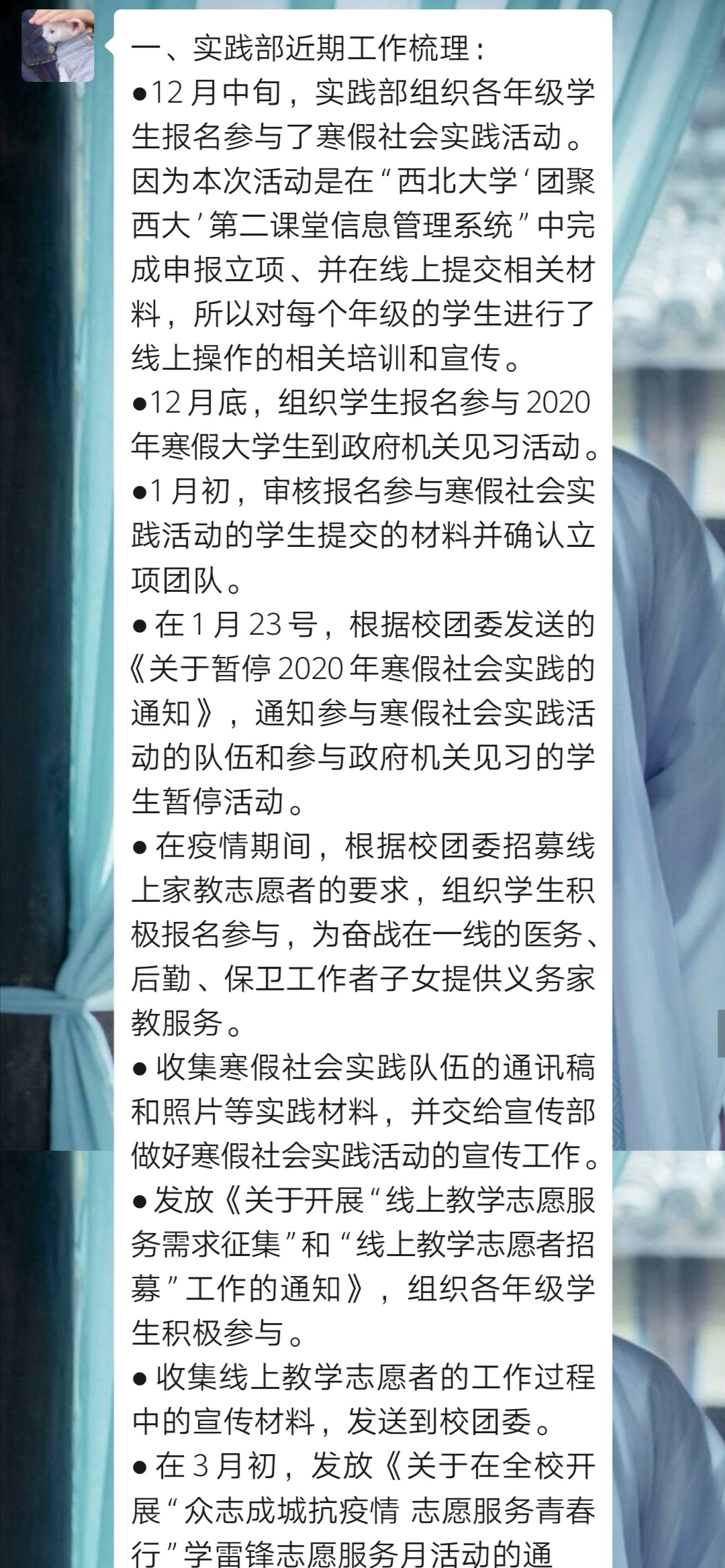会议最后,李鑫老师进行了总结发言。首先,李鑫老师对各部门在疫情期间的工作和努力表示肯定,鼓励大家在现有的基础上充分发挥创新和改造能力,更加完善本部门工作;其次,她对于团委下一阶段的几个重要活动提出建设性的意见;最后,她希望同学们在防疫期间做好防护,团结一致,共克时艰。此次会议之后,beat365亚洲版官网团委也必将在线上做好新学期各项工作、继续承担好团委责任!