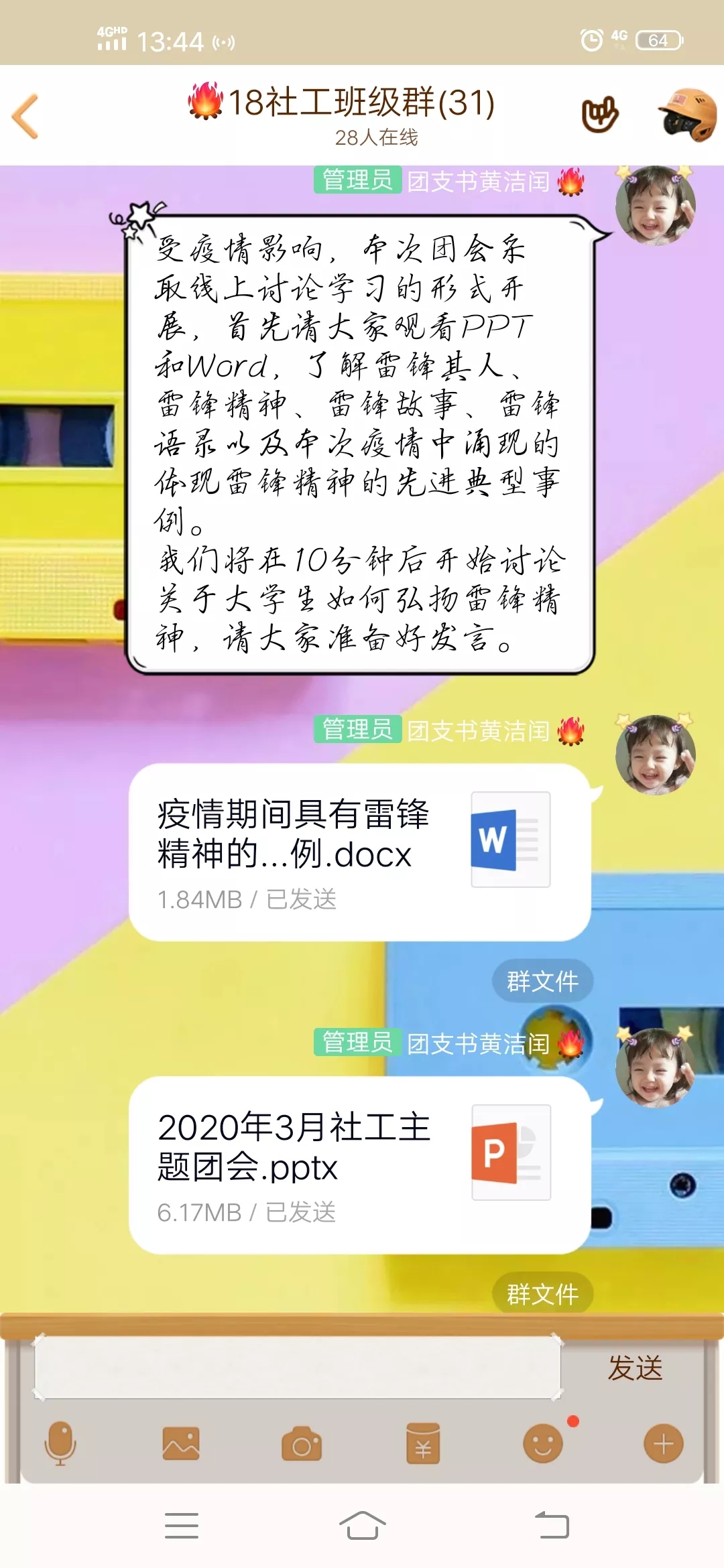 2020年3月13日上午10点,2018级社会工作团支部在班级QQ群内以线上的方式开展了新学期的第一次团会,主题为“雷锋精神暖三月,青春志愿伴我行”。