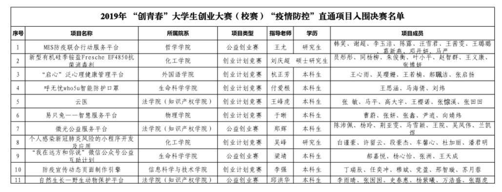 2019年“创青春”大学生创业大赛(校赛)开设“疫情防控”直通通道,“疫情防控”通道共收到来自全校9个学院的15个参赛项目,经校团委资格审查,最终11个项目入围本届“创青春”(校赛)终审决赛。