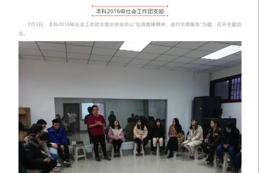 该支部组织号召团员积极参加团学组织活动,开展形式多样的集体活动,丰富了同学们的日常生活。除常规团学活动形式外,该支部还基于社会工作专业的专业优势,广泛开展以利他主义与人道主义为核心的专业实践,多次开展关注于社会弱势群体的社会活动,如开展围绕关爱独居老人、关爱流动留守儿童等为主题的活动。在课余时间也积极参与各类志愿服务,部分成员在此次疫情抗争的斗争中也发挥青年人的责任担当,成为志愿者为社区成员提供支持。参与各类团学组织活动,支部成员践行了团员义务,提升了社会责任感。同时,集体活动进一步提升了支部的凝聚力,让每一位成员紧紧依靠在一起,在相互支持中感受支部的温暖。