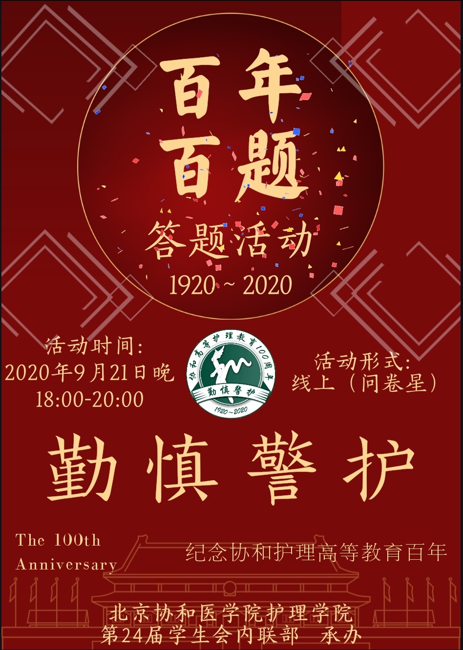 2020年9月21日,“百年百题”答题活动在线上如期举行。本次活动由BV伟德官方网站团委和第二十四届学生会主办,内联部承办。此次活动面向BV伟德官方网站老师以及18、19、20本全体同学,旨在纪念百年来协和人在高等护理教育建设过程中的探索与成就,激励新时代协和学子深入理解并传承协和精神。