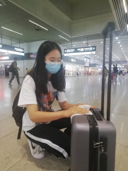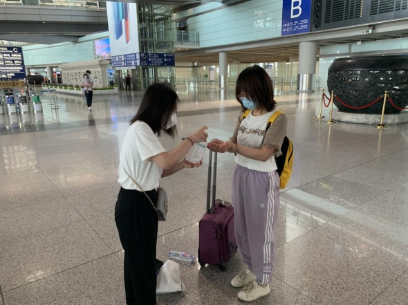 在火车站、机场等接站处,接站组师生精心准备体温枪、水银体温计、乳胶手套、口罩、手消液、消毒湿纸巾等,组织学生完成更换口罩、检测体温、行李消杀等系列防疫措施后,乘坐专车抵达校园。