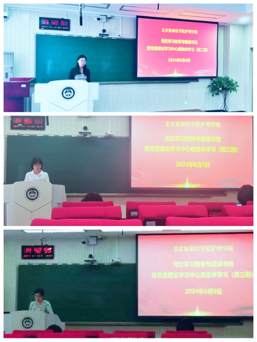 6月4日举行读书班第二次集体学习,党委书记安道彩逐条领学《条例》总则条款,党委委员、院长李峥逐条领学分则政治纪律条款。6月5日举行读书班第三次集体学习,党委委员、副院长王欢逐条领学分则工作纪律、生活纪律和附则条款,党委委员、副院长梁涛逐条领学廉洁纪律条款,党委委员、党政办主任金娜逐条领学组织纪律和群众纪律条款。