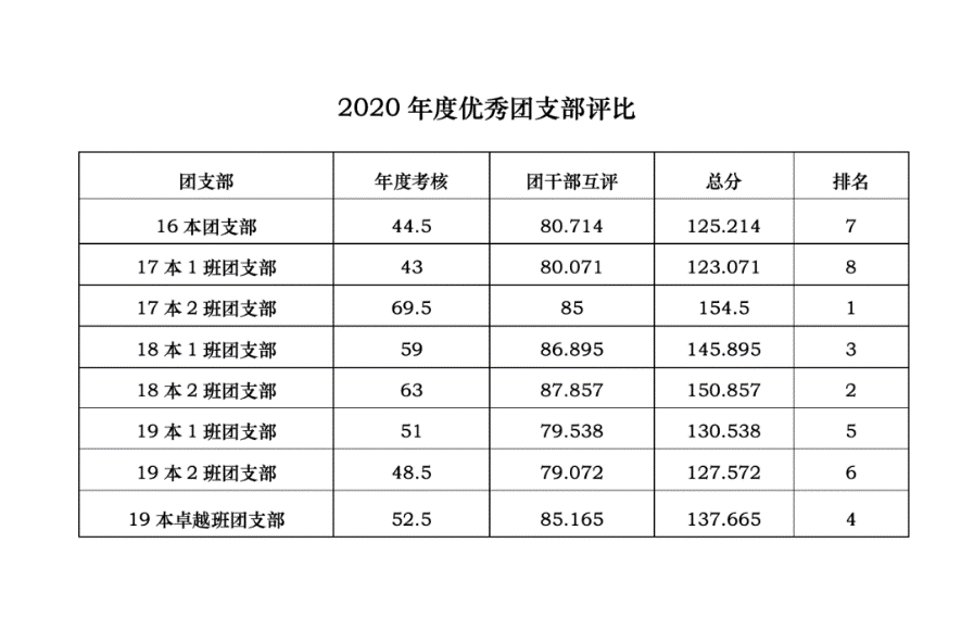 本次优团评比考核分为年度考核和团干部互评两部分。为了进一步确保评比过程的公平公正性、评比结果的客观真实性,组织部进一步细化优团评比中年度考核部分的评分标准,明确了包括“青年大学习”“团课和主题团日”的开展和宣传、“团员进社区”“党团实践活动”等各项活动的评分细则,并在与各团支部干部的商议中确定了最后的方案。