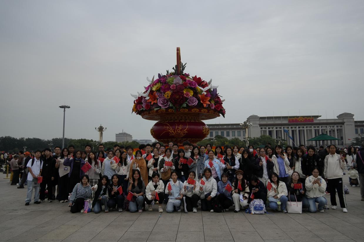 同学们满怀着激动的心情,挥舞着手中的国旗,在天安门广场的巨大花篮前合影留念。