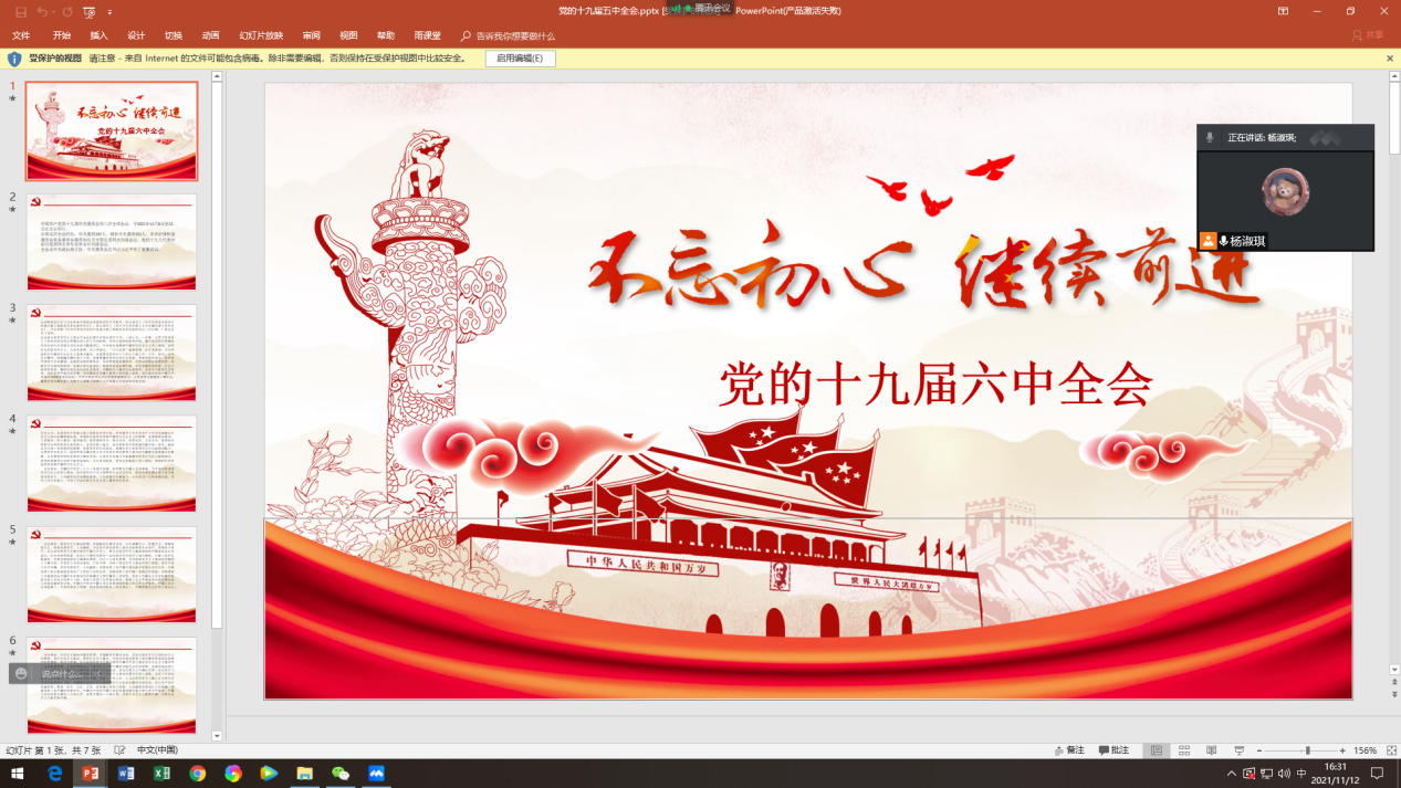 党的十九届六中全会在重要的历史节点召开,内容丰富而厚重,具有重大现实意义和深远历史意义,是一次注定载入中华民族伟大复兴史册的重要会议。我支部于11月12日晚观看十九届六中全会精神的视频学习。会后,青年们表示定会勇担时代责任,努力奋斗,在今后的工作和生活的当中,为祖国做出自己的一份贡献,成为社会主义事业合格的建设者和接班人。