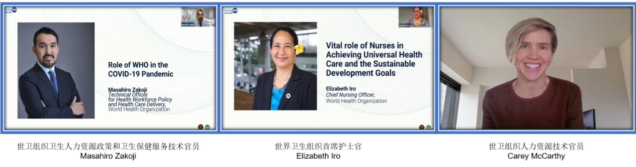 11月2日,以“全球健康护理现况”为主题的第一场网络研讨会顺利召开,世界卫生组织首席护士官Elizabeth Iro介绍了护士在实现全民健康覆盖和联合国可持续发展目标中的重要作用。世界卫生组织卫生人力资源政策和卫生保健服务技术官员Masahiro Zakoji讲述了WHO在全球新冠肺炎疫情中发挥的领导作用。世界卫生组织人力资源技术官员Carey McCarthy介绍了2021年WHO发布的《2021-2025加强护理和助产工作的全球战略方向》。通过专家对全球健康状况的解析,对护士在健康领域所做贡献的回顾,以及对加强全球护理与助产工作的战略方向的介绍,使学员从宏观层面更好地了解到全球健康及护理的概况,全球健康发展政策战略与方向,更明晰了提升专业领导力所需努力的目标。