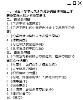 “读讲一本书”:读讲内容为《国家卫生健康委直属机关党委2020年推荐阅读书目》,包括习近平总书记关于新冠肺炎疫情防控工作的重要指示批示和重要讲话;理论类书籍;素质类书籍。