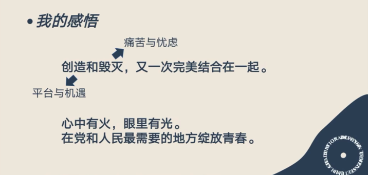 2020年是注定不平凡的。新冠疫情的暴发为我们敲响了警钟。无数的青年医护、青年科学家、青年志愿者挺身而出,在最需要他们的抗疫一线奉献着自己的青春。可以说,创造和毁灭,就这样又一次完美结合在一起。新冠病毒带来了失去同胞的痛苦、发展减速的忧虑。但与此同时,它给新时代的青年创造了为党为国为人民奉献青春的平台与机遇,也让我们更加清楚地认识到自己的渺小。