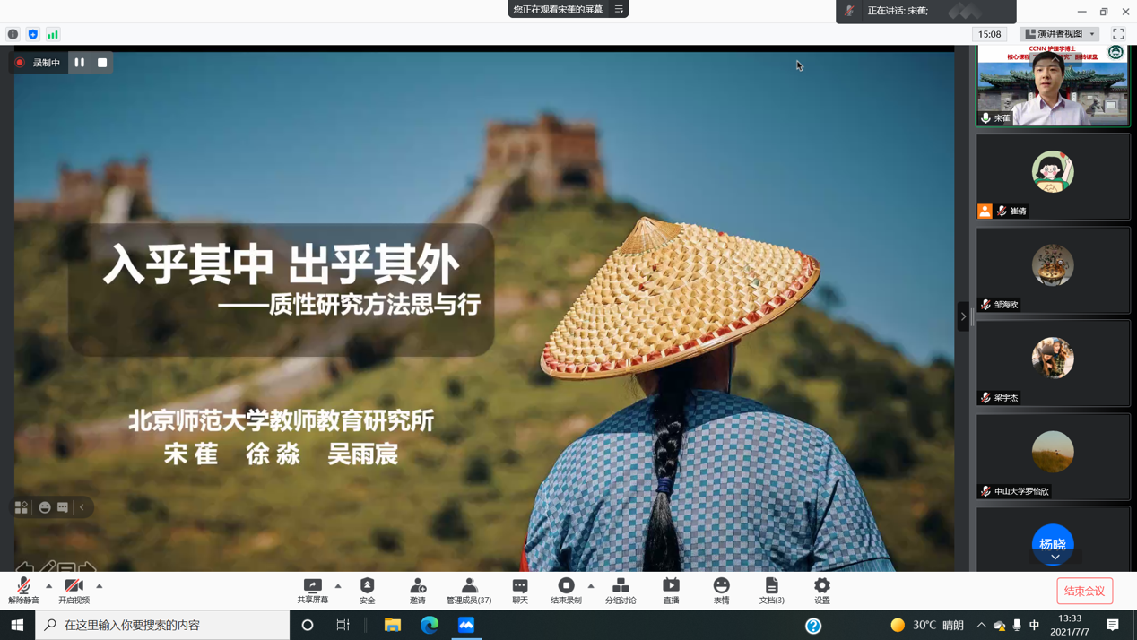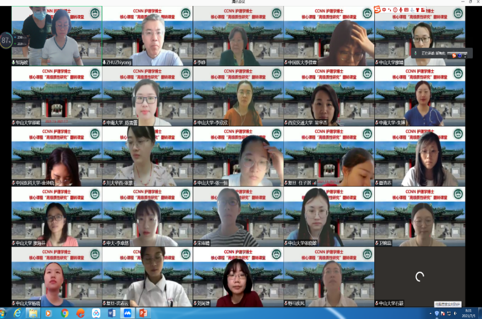 2021年7月5日-7日,由BV伟德官方网站负责的美国中华医学基金会中国护理网(China Medical Board China Nursing Network,CCNN)护理学博士核心课程“高级质性研究”课程的翻转课堂部分在线上成功举办并圆满结束。来自北京协和医学院、复旦大学、四川大学、中南大学、中国医科大学、西安交通大学、中山大学共7所大学的33名护理学博士生在前期完成7周线上课程的基础上,于云端相会,完成了为期3天的翻转课堂,对高级质性研究课程进行了更加深入地学习和交流。学习中,同学们学习热情高涨,课下认真准备,课上热烈讨论,热烈的思维激荡与观点碰撞加深了对于质性研究的思考,进一步拓展了博士生对护理研究中质性研究方法及其应用的理解和认识。