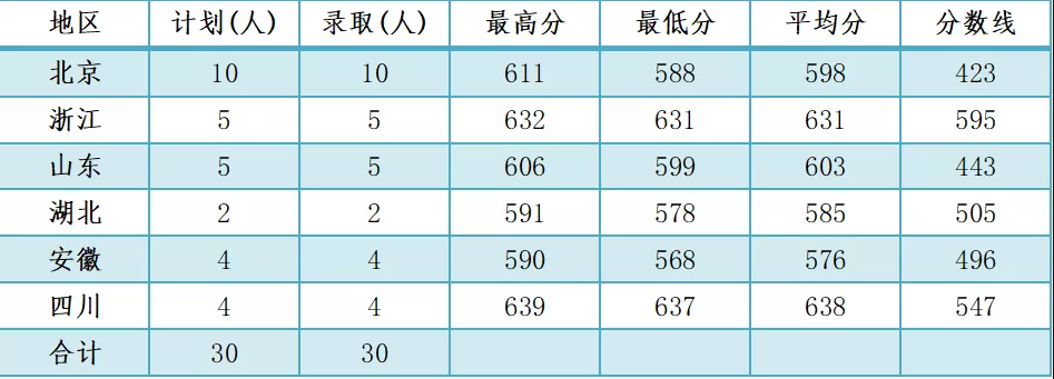 护理卓越班(6年制)录取情况:2019年护理学专业“卓越班”计划招生30 名,实际录取学生30名,计划完成100%。分布在北京、浙江、四川、山东、安徽、湖北6个省市。